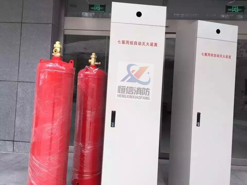 裝置包括儲存瓶、啟動裝置、安全泄壓閥、壓力表、柜體、壓力信號器、噴射短管、噴頭、七氟丙烷滅火劑。